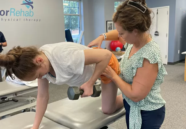 We were more than happy to help Alisha out. Her therapist helped her develop a general strength training program using barbells and dumbbells. He walked her through each exercise, assessed her lifting form, and guided her on gradually increasing intensity.