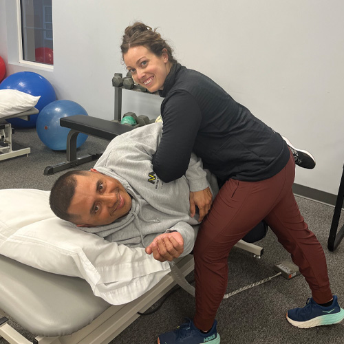At the PT clinic, Daniel shared his symptoms and noted that the pain had started while he was doing yard work. His therapist also guided him through several movement screens, testing Daniel’s range of motion and strength.